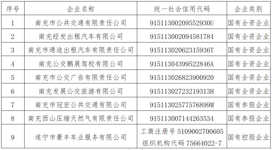 南充市公共交通有限責(zé)任公司監(jiān)管全級(jí)次企業(yè)名單
